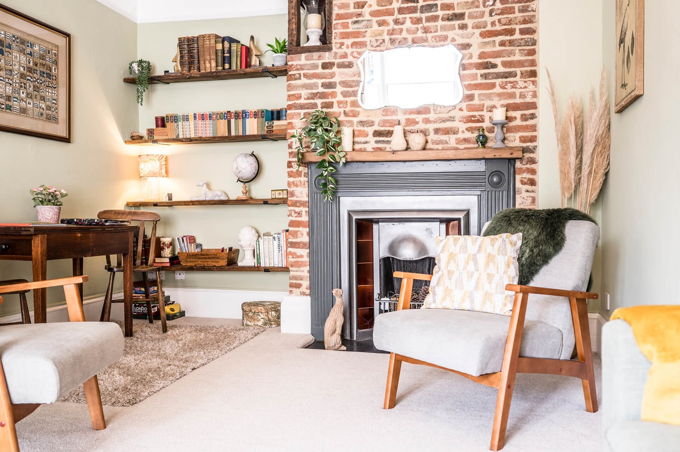 Sitting Room: Window to front with window seat, large sofa, armchairs, ornamental fireplace, bookshelves and Smart TV, extendable dining table and chairs.