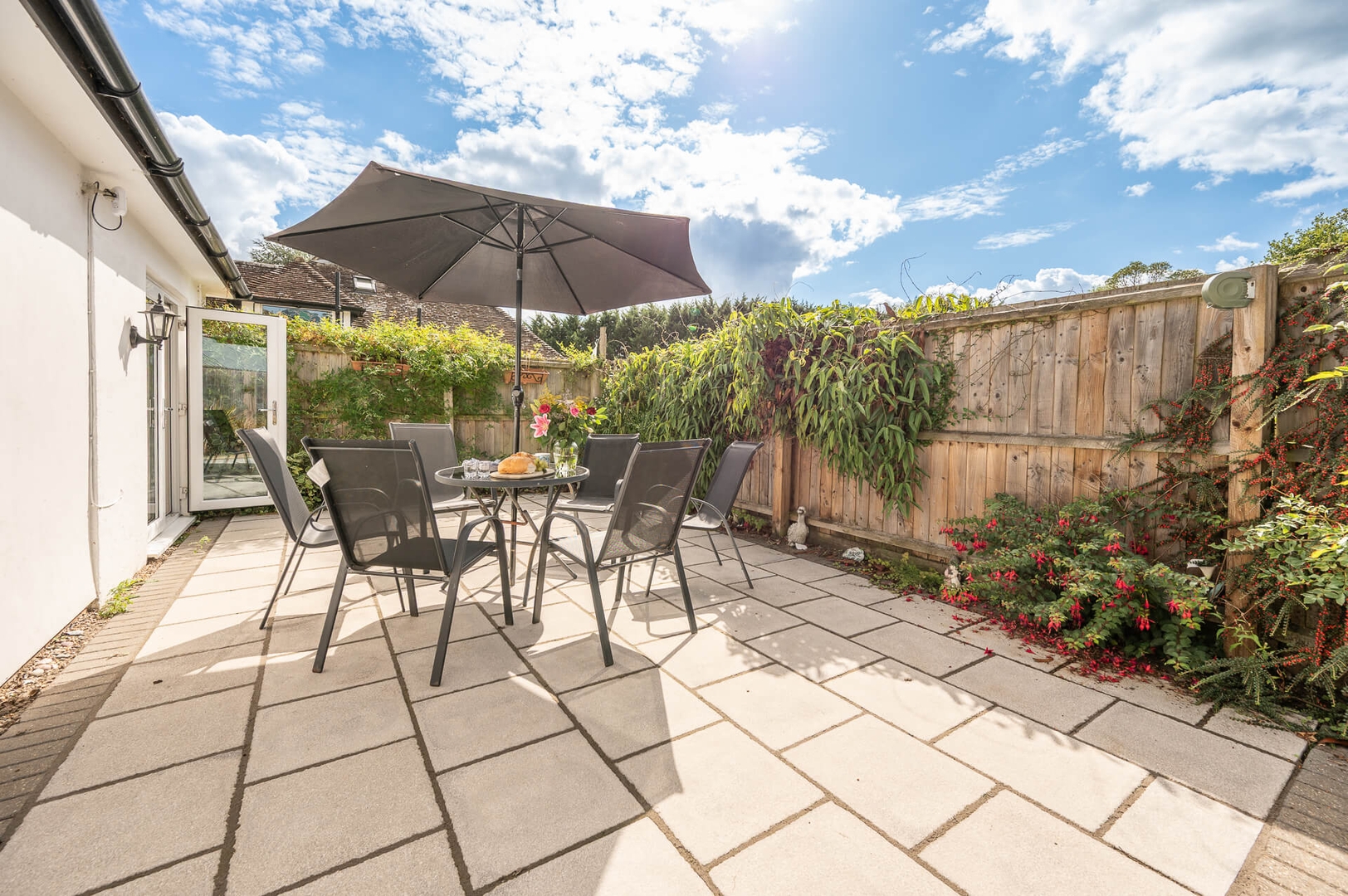 Outside: A fully enclosed, paved terrace with table, chairs and parasol.